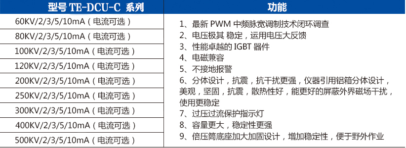 TE-DCU-C系列直流高壓發(fā)生器是按照中國(guó)行業(yè)標(biāo)準(zhǔn)ZBF 24003-90《便攜式直流高壓發(fā)生器通用技術(shù)條件》的要求,研究、制造的便攜式直流高壓發(fā)生器,適用于電力部門、廠礦企業(yè)動(dòng)力部門、科研單位、鐵路、化工、發(fā)電廠等對(duì)氧化鋅避雷器、磁吹避雷器、電力電纜、發(fā)電機(jī)、變壓器、開(kāi)關(guān)等設(shè)備的直流高壓試驗(yàn)。