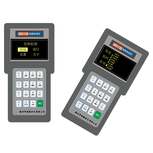 SB5108智能手持式校線儀。一套 手持校線儀包括主機(jī)、從機(jī)兩個(gè)儀器。主機(jī)包括8個(gè)輸出端口、1個(gè)公 共地、1個(gè)語音端口和1個(gè)手電筒指示燈;從機(jī)包括1個(gè)接收端口、1 個(gè)公共地、1個(gè)語音端口和1個(gè)手電筒指示燈。校線時(shí)主機(jī)和從機(jī)分別 位于待校線的兩端,按操作說明書要求正確接線,主機(jī)發(fā)送待測(cè)線的 標(biāo)識(shí)信息,從機(jī)屏幕上會(huì)顯示當(dāng)前接線的名稱信息。主機(jī)具有鍵盤, 可現(xiàn)場(chǎng)編輯每條待測(cè)線(對(duì)應(yīng)裝置每個(gè)端口)的名稱,也可導(dǎo)入已經(jīng) 編輯好的線路名稱。校線過程中主機(jī)和從機(jī)可以通過一根已知線纜進(jìn) 行有線通話,語音清晰,工作可靠,可大大提高校線效率。 該儀器不僅具有校線準(zhǔn)確、迅速、可單人操作的優(yōu)點(diǎn),而且把通 話部分嵌入到設(shè)備內(nèi)部,現(xiàn)場(chǎng)采用有線語音通訊,從而擺脫了無線通 訊的限制。和萬用表相比優(yōu)勢(shì)在于可以輸入和顯示待校線路的編號(hào), 而不是單純的通斷提示。該裝置還可以快速檢測(cè)待校線是否存在對(duì)地 短路故障和線間短路故障,并可以顯示所有短路線路的序號(hào),便于相 關(guān)人員及時(shí)排除短路故障。