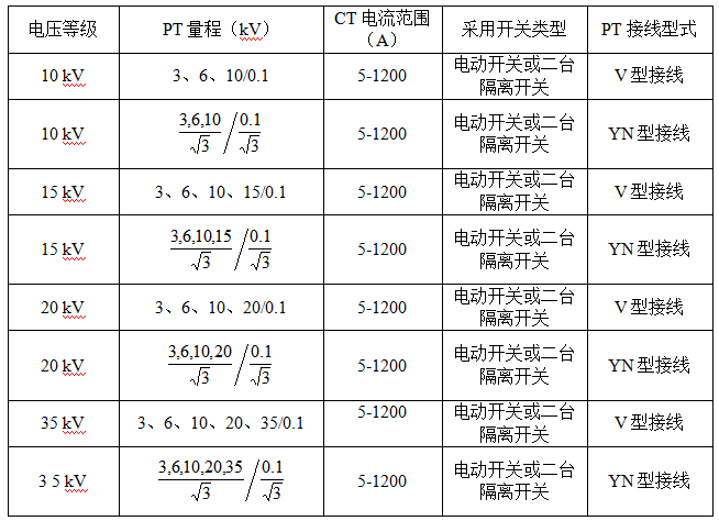 電機(jī)試驗(yàn)一般由3臺(tái)CT,2臺(tái)PT,V型接線組成,其電壓一般10kV,電流1200A以下,PT做成二次抽頭式的,CT也做成二次抽頭切換式的,高電流值/小電流值=K≤20,這樣可省去電動(dòng)開關(guān),僅保留一個(gè)隔離刀開關(guān)即可,如K≥20以上,可將CT一次分為兩級(jí),滿足測(cè)量電流跨度要求,這樣需要用2臺(tái)隔離開關(guān)即可滿足要求。